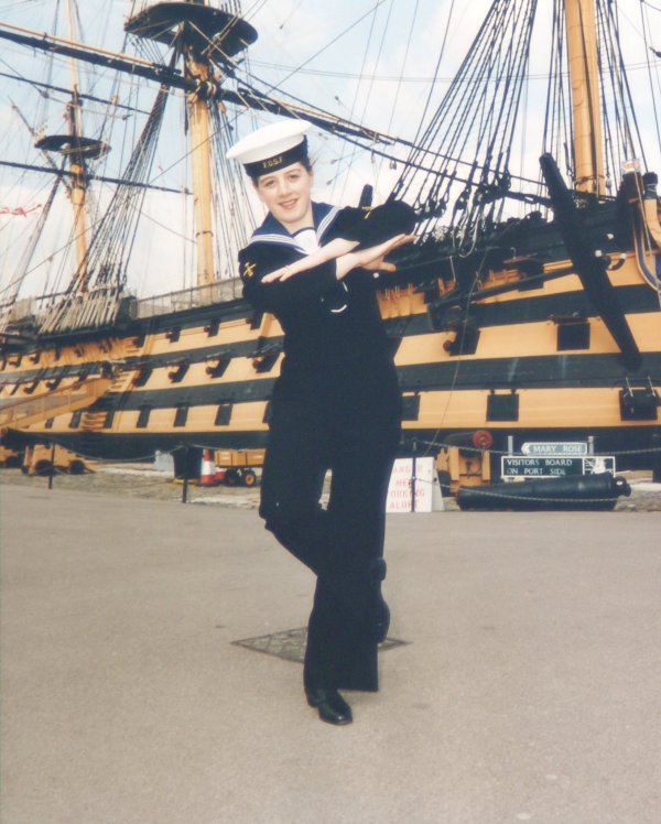 The photograph was taken with HMS Victory in the background at Portsmouth Historic Naval Dockyard. The wren is wearing the cap tally of FOST (Flag Office Sea Training). We don’t know who this wren is, so help needed if possible to identify who she is.